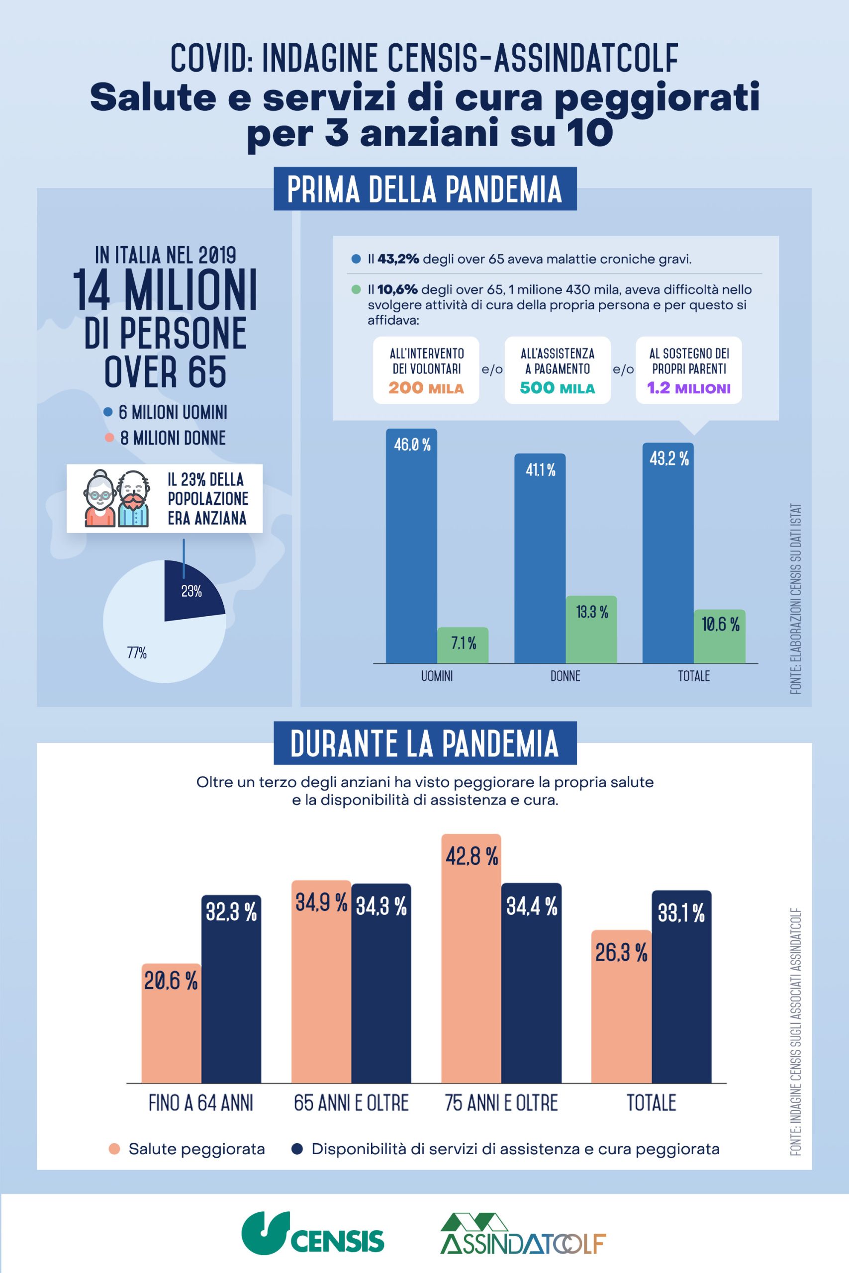 “Nel 2019, ovvero prima dell’avvento della pandemia – dichiara Andrea Toma, direttore di ricerca del Censis che ha curato l’indagine commissionata da Assindatcolf, citando una rielaborazione dei dati Istat – gli anziani con malattie croniche gravi rappresentavano il 43,2% degli over 65. Mentre il 10,6% aveva gravi difficoltà a prendersi cura della propria persona. Parliamo di circa 1 milione 430 mila persone che per far fronte alle esigenze quotidiane erano costrette ad affidarsi al sostegno dei propri parenti (oltre un milione e 200mila), all’intervento di volontari (poco meno di 200mila) o a richiedere assistenza a pagamento (oltre mezzo milione si è rivolto a badanti o ad altre figure dedicate alla cura della persona)”.