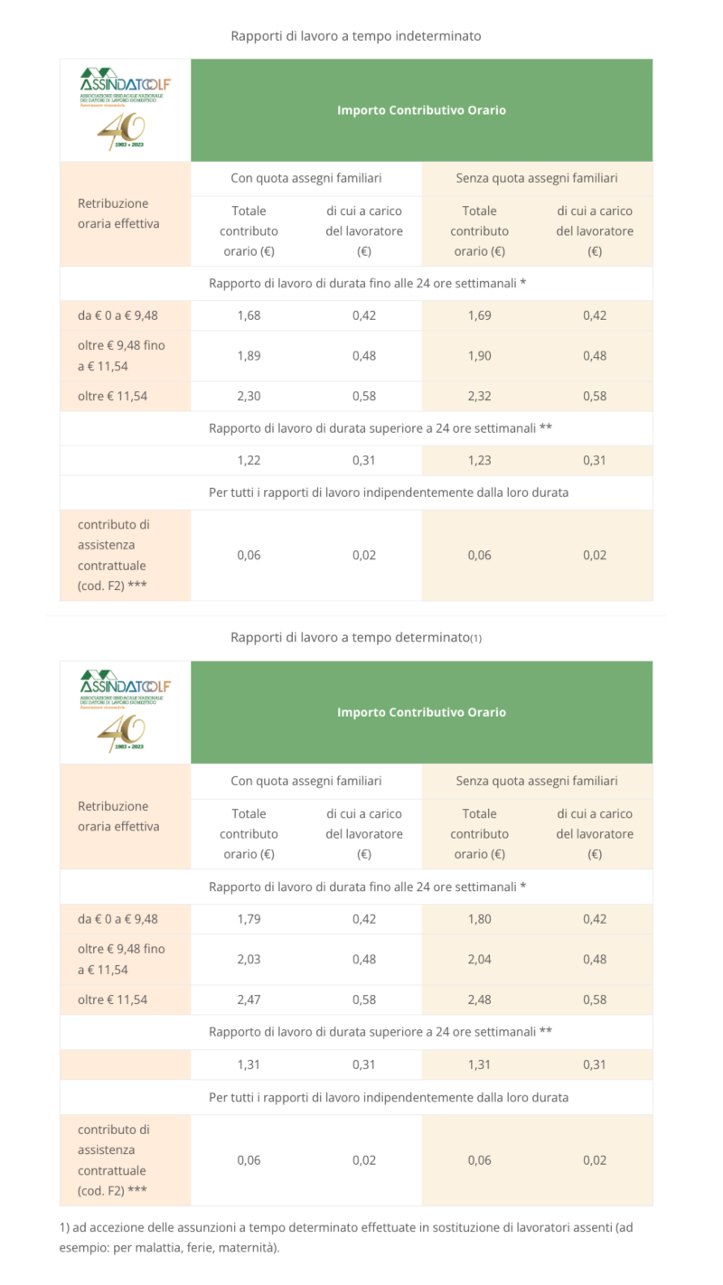 * Il contributo senza la quota degli assegni familiari è dovuto quando il lavoratore è coniuge del datore di lavoro o è parente o affine entro il 3° grado e convive con il datore di lavoro.